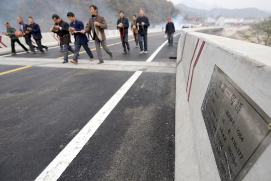 11月10日,大別山旅游扶貧快速通道水毀修復(fù)工程漁潭段改線建成通車。當(dāng)?shù)卮迕袂描尨蚬摹⑤d歌載舞,以自己特有的方式歡慶這一時(shí)刻的到來.